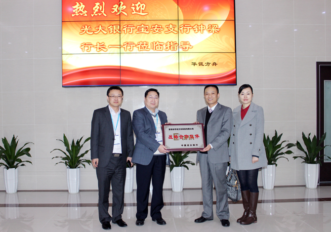 2012年12月27日,中國光大銀行深圳寶安支行行長鐘梁一行蒞臨華迅方舟集團(tuán),向集團(tuán)贈送了承載著光大寶安支行與華訊方舟集團(tuán)深厚合作情誼的“戰(zhàn)略合作伙伴”牌匾